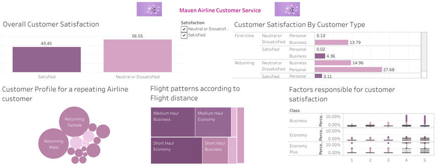 In this project, I delved into the Maven Airline challenge, a dataset containing feedback from over 120,000 airline passengers. The analysis encompassed crucial inquiries, including assessing passenger satisfaction, revealing the loyal passenger profile, examining the impact of flight distance, and identifying key influencers of satisfaction. This project showcased the power of data analysis and visualization in understanding airline customer behavior and preferences. Do checkout my medium and Tableau website for more details about this project.